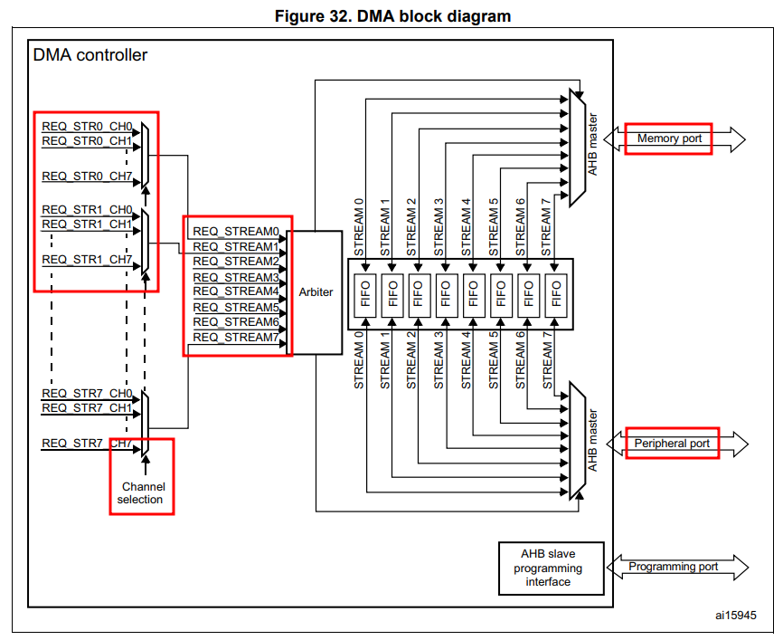 각 DMA는 중간의 8개의 Stream을 가지고 있으며, 좌측을 보게되면 각 Stream은 8개의 선택적 채널을 가지고 있다.