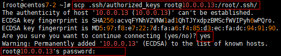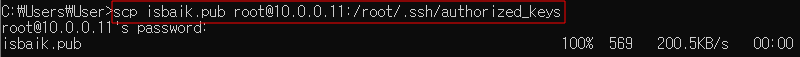 - 생성한 공개키를 /root/.ssh/authorized_keys 파일에 scp를 사용해 복사해준다.
