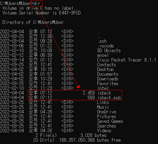 - dir 명령어로 HOST PC의 폴더 및 파일을 확인하게 되면 "isbaik"의 개인키와 공개키(.pub)를 확인 할 수 있다.