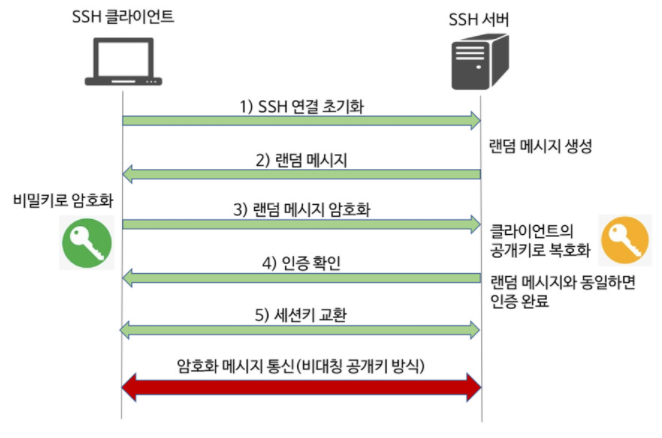 - 메인이 되는 서버에서 개인키와 공개키를 생성한 다음 서버에 개인키는 메인이 되는 서버에 공개키는 메인 서버에 접근 할 클라이언트 서버에 부여하게 되면 다음 과정을 통해 SSH를 통해 원격지로 접속 할 수 있게 된다.
