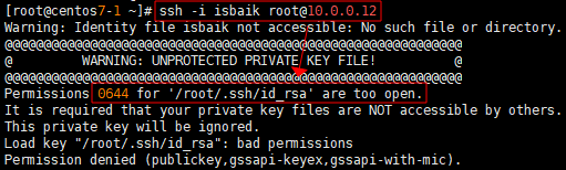 - 키 기반으로 접속해보기 위해 ssh -i [개인키명] root@[접속할 서버 IP]를 입력해보면 처음에 오류가 나는 것을 확인 할 수 있는데 이는 개인키 파일에 대한 접근 권한이 group과 other에도 적용되어 있기 때문에 접속이 되지 않는다.