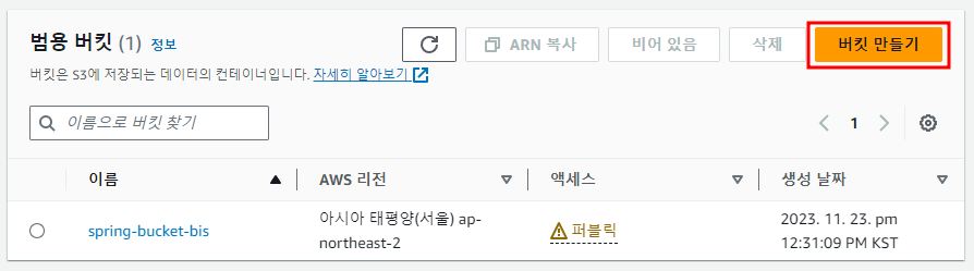 1. S3 생성 AWS S3를 통해 bucket을 생성한다. - bucket : 다수의 객체를 관리하는 컨테이너로 파일시스템이라고 보면 된다. 체크를 하지 않으면 public으로 해당 버킷에 접근 할 수 있다. public으로 접근 가능하다는 것은 외부에서 해당 버킷에 접근이 가능하다는 뜻이다. 2. 사용자 생성 (IAM) AWS IAM을 통해 사용자를 생성한다. 사용자의 권한 정책으로 AmazonS3FullAccess 권한을 부여해준다. 3. 액세스 키 생성 새롭게 생성한 사용자를 선택하여 액세스 키를 생성해준다. 생성한 액세스키, 비밀 액세스 키는 따로 확인 가능하도록 보관해놓는다. 4. 스프링 연동 4.1. build.gradle 의존성 추가 implementation 'org.springframe..