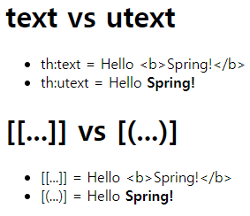- 타임리프 특징 1. 서버 사이드 HTML 렌더링 (SSR) 2. 네츄럴 템플릿 3. 스프링 통합 지원 - 서버 사이드 HTML 렌더링 (SSR) 1. 타임리프는 백엔드 서버에서 HTML을 동적으로 렌더링 하는 용도로 사용된다. - 네츄럴 템플릿 1. 순수 HTML을 그대로 유지하면서 뷰 템플릿도 사용할 수 있는 타임리프의 특징을 네츄럴 템플릿 (natural templates)이라 한다. - 스프링 통합 지원 1. 타임리프는 스프링과 자연스럽게 통합되고, 스프링의 다양한 기능을 편리하게 사용할 수 있게 지원한다. - 기본 표현식 • 간단한 표현: ◦ 변수 표현식: ${...} ◦ 선택 변수 표현식: *{...} ◦ 메시지 표현식: #{...} ◦ 링크 URL 표현식: @{...} ◦ 조각 표현식: ~..